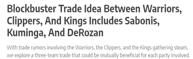 新赛季开打已经一个月,西部的形势也渐渐清晰,雷霆豪取10连胜,赛季至今仅有一败!湖人、掘金、火箭都展现出不俗的实力。而一些老牌则陷入挣扎,金州勇士以10胜10负徘徊于西部中游,洛杉矶快船在5胜13负的泥潭中挣扎,萨克拉门托国王更是拿到5胜14负战绩深陷重建迷雾,强队战绩越来越出色,让一些想要染指季后赛的球队,不得不考虑通过交易改变球队的现状!美媒露天看台,提出一笔涉及三大球星的三队交易构想,其中小萨博尼斯、库明加、德罗赞的互换东家,有望改变三支球队的现状。