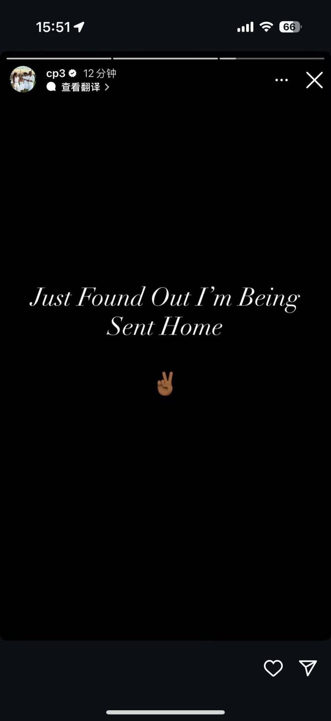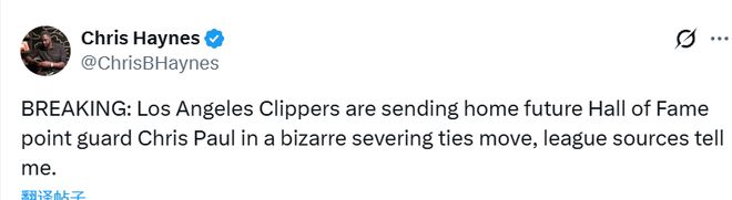 保罗几分钟之前社媒表示:“我刚被通知,我要被送回家了。”名记Haynes报道称,据联盟消息人士向我透露,洛杉矶快船队正以一种出人意料的解约方式,将未来名人堂级别的控卫克里斯-保罗送走。